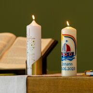 „Beim ersten dachte ich noch, ich sei dafür nicht kreativ genug!“, erinnert sich Eva Berger lachend. Was sollte sie denn mit buntem Wachs auf eine solche Kerze kleben? Doch zwei weitere Patenkinder und noch mehr Taufkerzen später fühlt sie sich schon fast als Expertin. „Es macht richtig Spaß, sich zu überlegen: Was passt zu dem Kind und seinem Taufspruch?, und es dann symbolisch umzusetzen.“